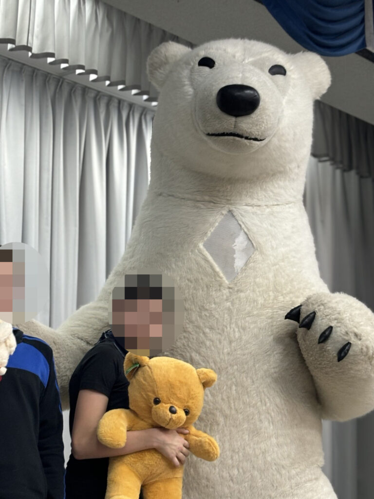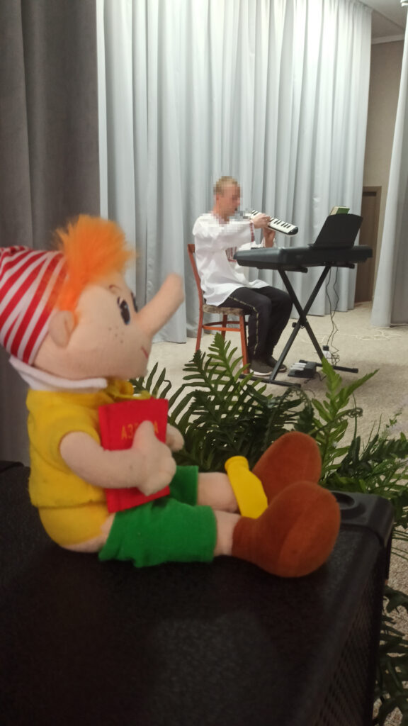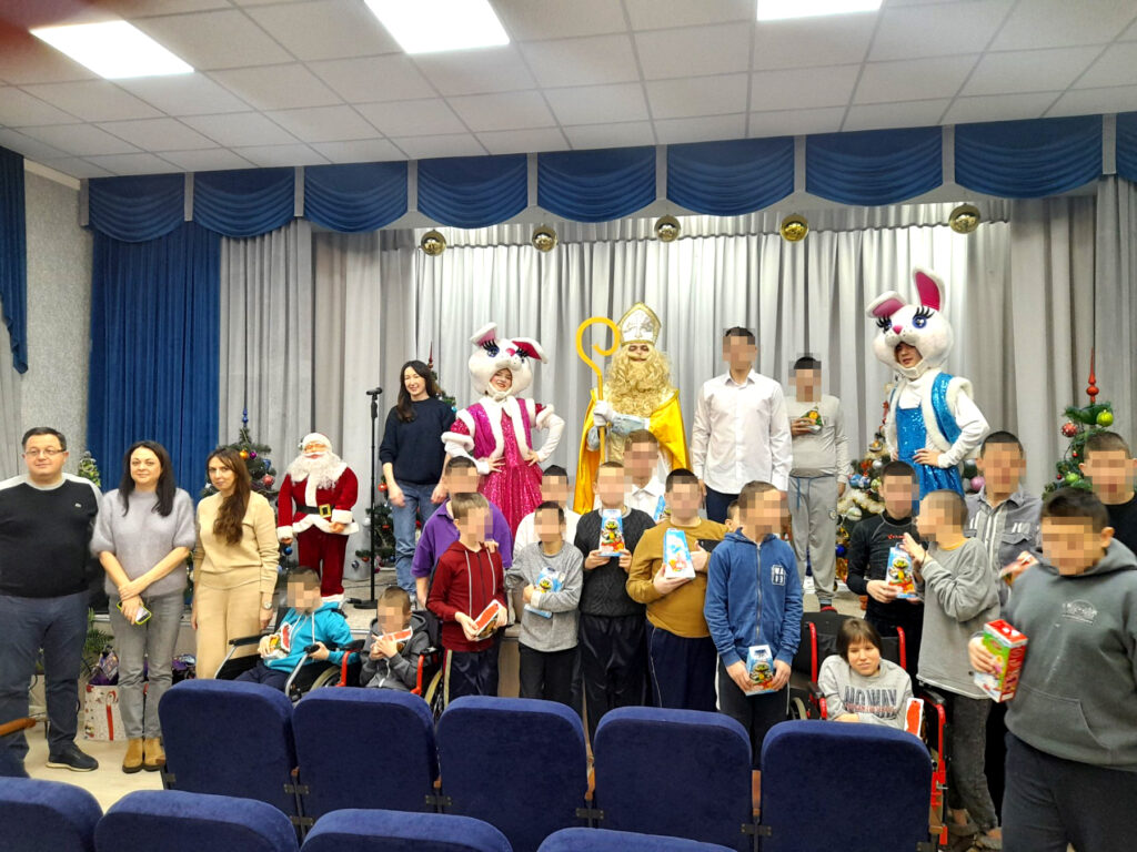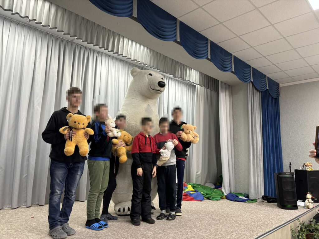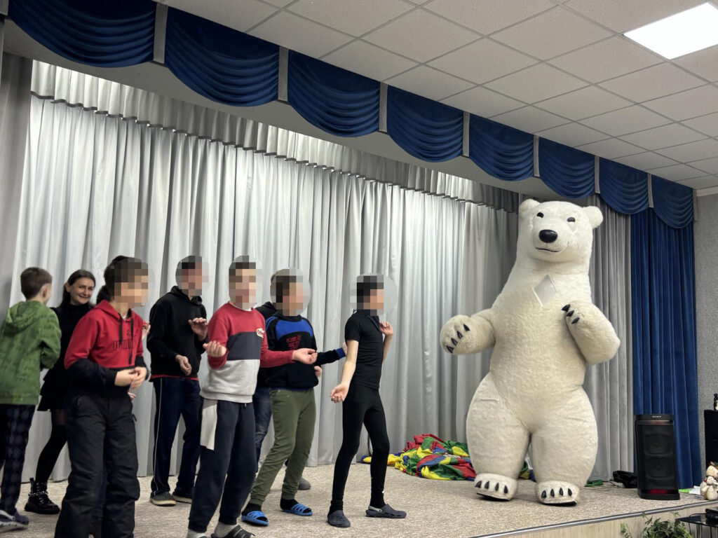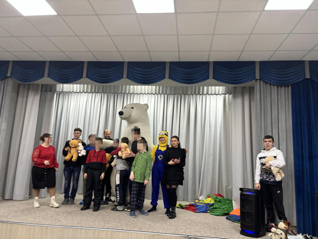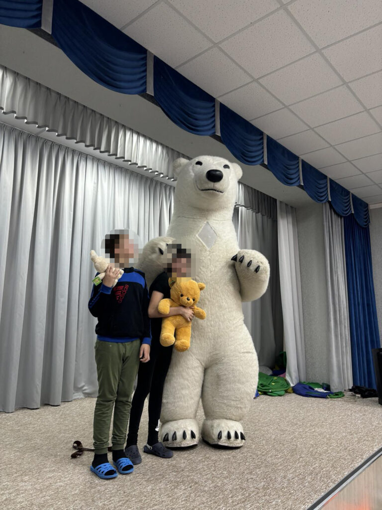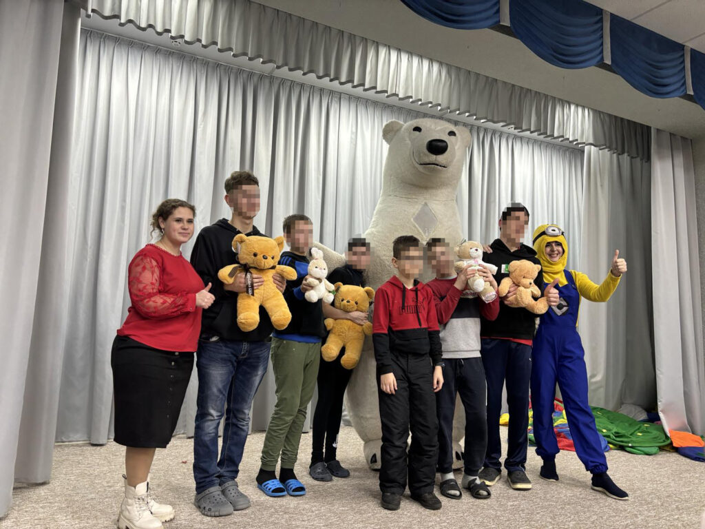 Напередодні дітям подарували святковий настрій Олександра, Олена і Ведмедик Барні. Привітання були гучні і веселі, дітки танцювали і обіймалися з Ведмедиком, а потім отримали подарункові набори.